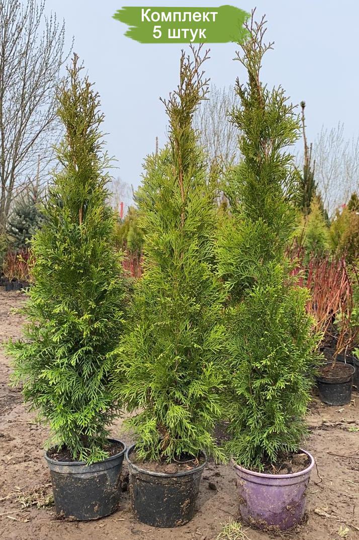 Приобретите комплект из пяти шикарных саженцев Туи Смарагд, чтобы создать живописную живую изгородь или добавить изысканности вашему садовому ландшафту. Туя Смарагд - это популярный сорт вечнозелёной хвойной культуры, который отличается конусовидной формой и ярко-зелёной окраской круглый год.